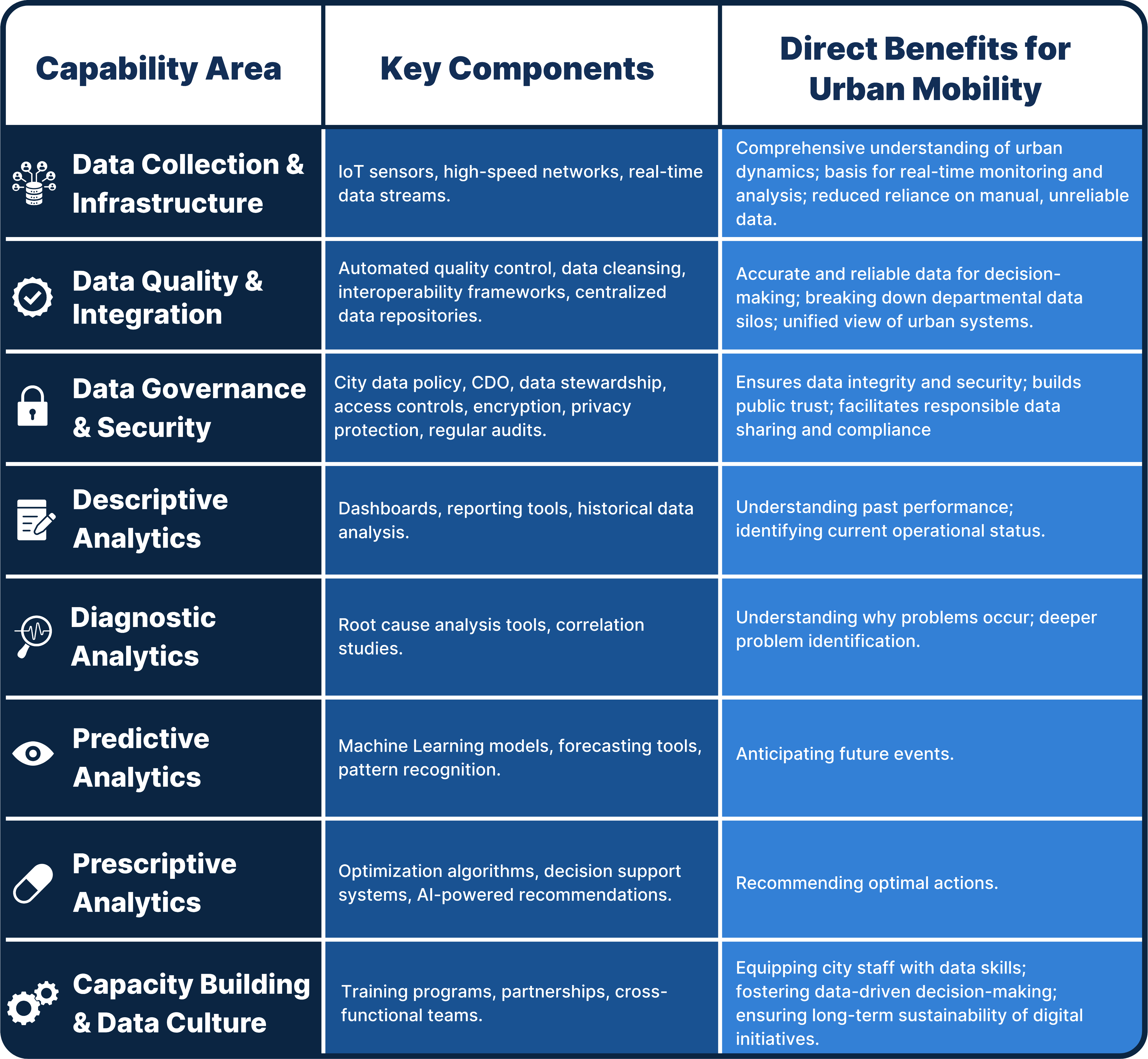 Instead, cities should immediately focus on building a robust data strategy and mastering urban mobility data analytics. This involves improving data collection, ensuring quality and integration, establishing governance, and investing in human capital. By prioritizing descriptive, diagnostic, predictive, and prescriptive analytics, cities can achieve significant, tangible improvements now.