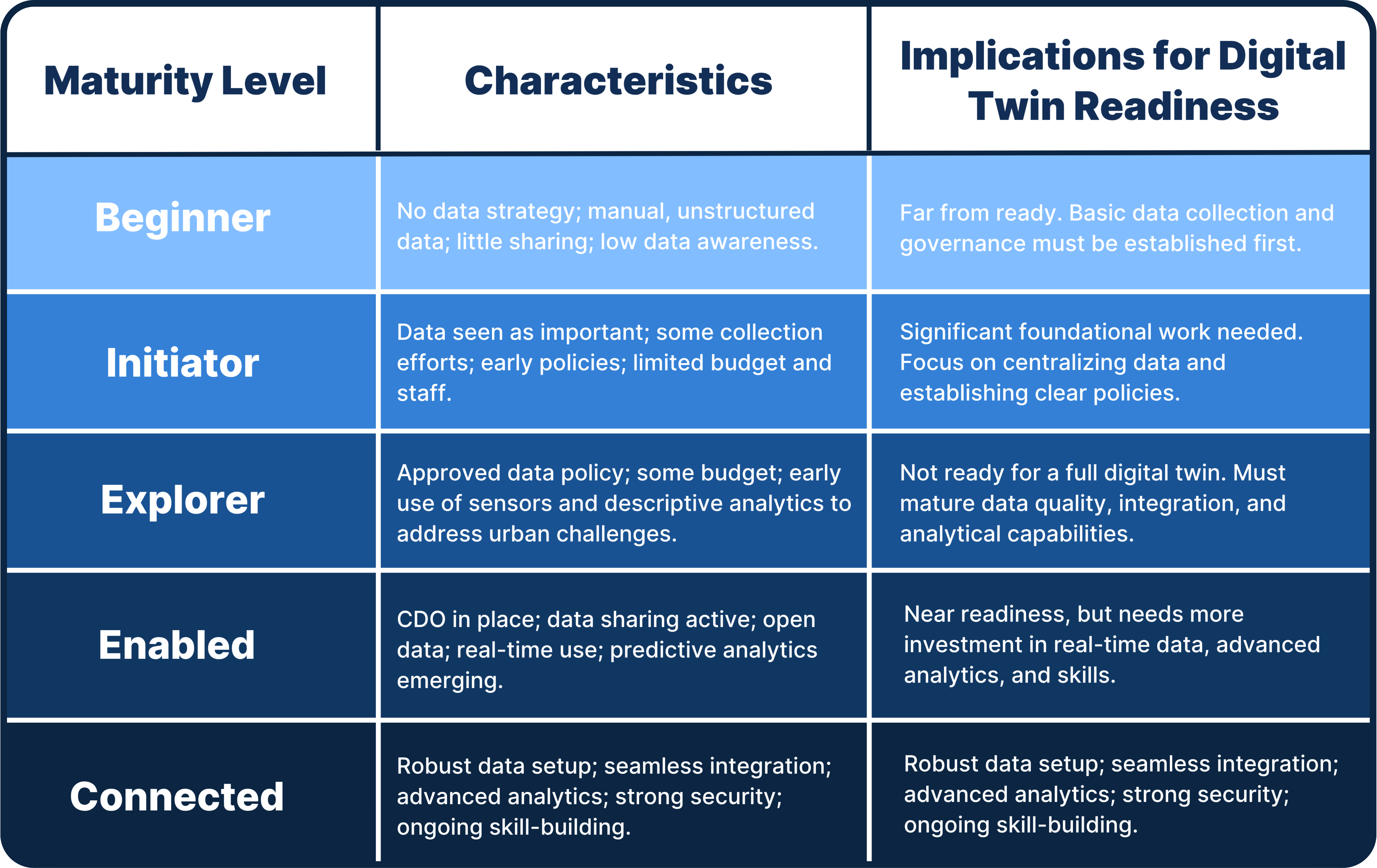 These challenges are compounded by low data maturity levels; up to 90% of city-scale digital twin implementations are still in "initial to medium stages," focusing on basic 3D modeling rather than advanced analytics. Many cities are still establishing fundamental data policies, budgets, and internal capacity. Global assessments confirm uneven progress in digital readiness. Investing in a digital twin without addressing these issues is inefficient and carries a high risk of failure, as many smart city initiatives "underdeliver" due to a lack of readiness. Cities must prioritize building robust, foundational data capabilities first.
