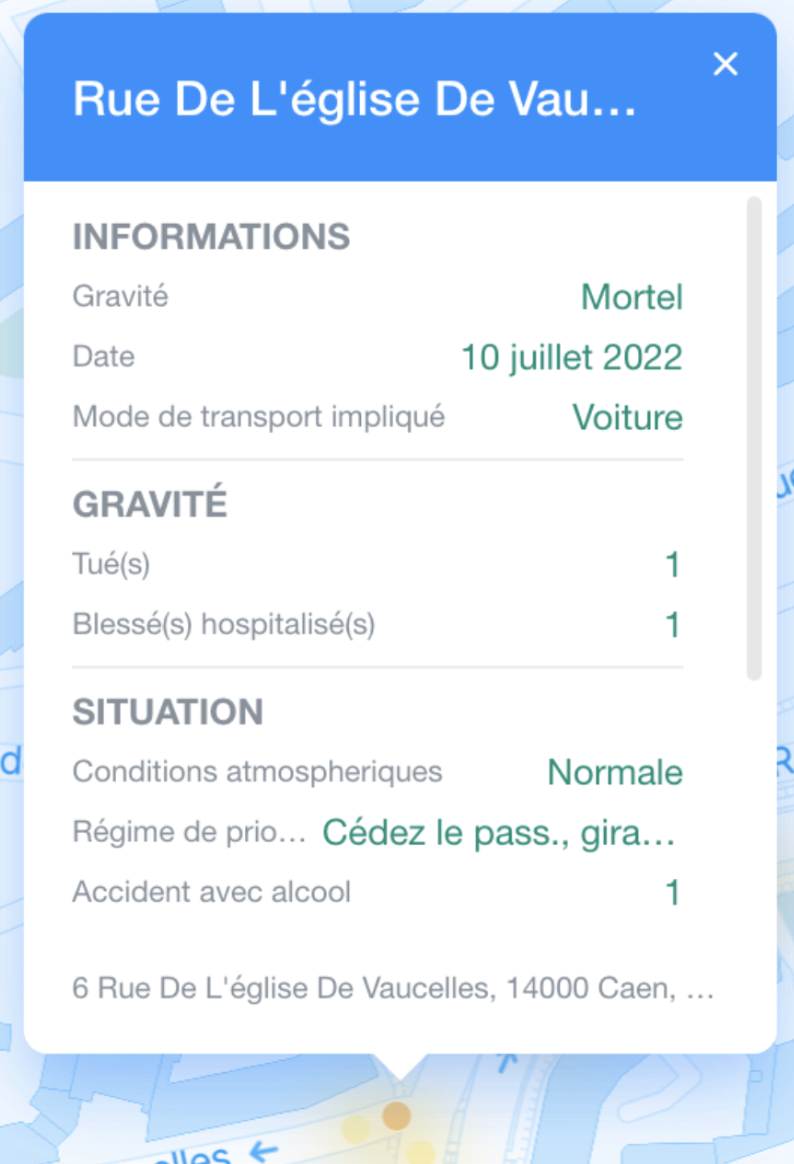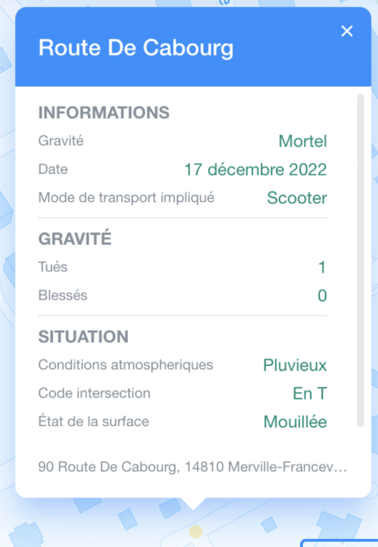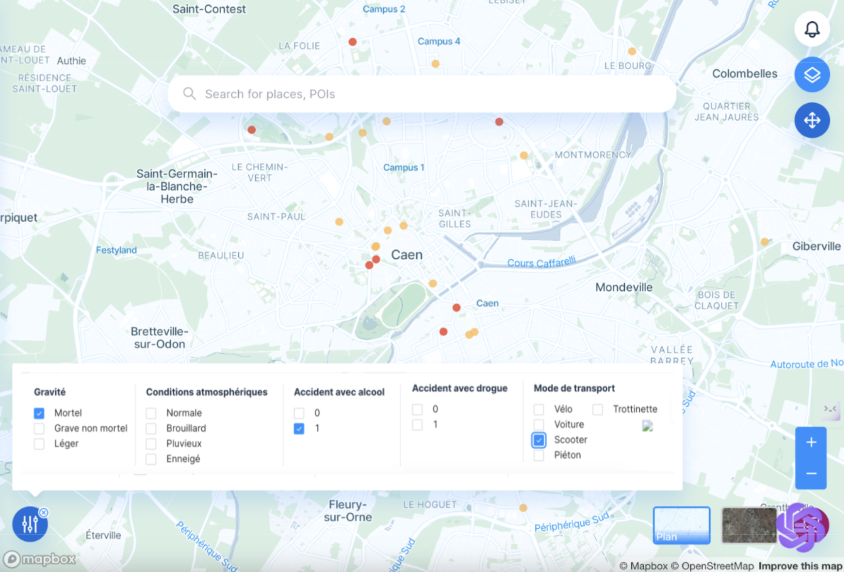 The filter function also allows users to highlight relevant elements of historical accident data according to their needs. For example, the city of Caen can filter out accidents involving alcohol and resulting in fatalities. Additionally, the city can filter by mode of transport, such as scooter accidents, or by time of day, such as accidents occurring during rush hour, along with many other elements.