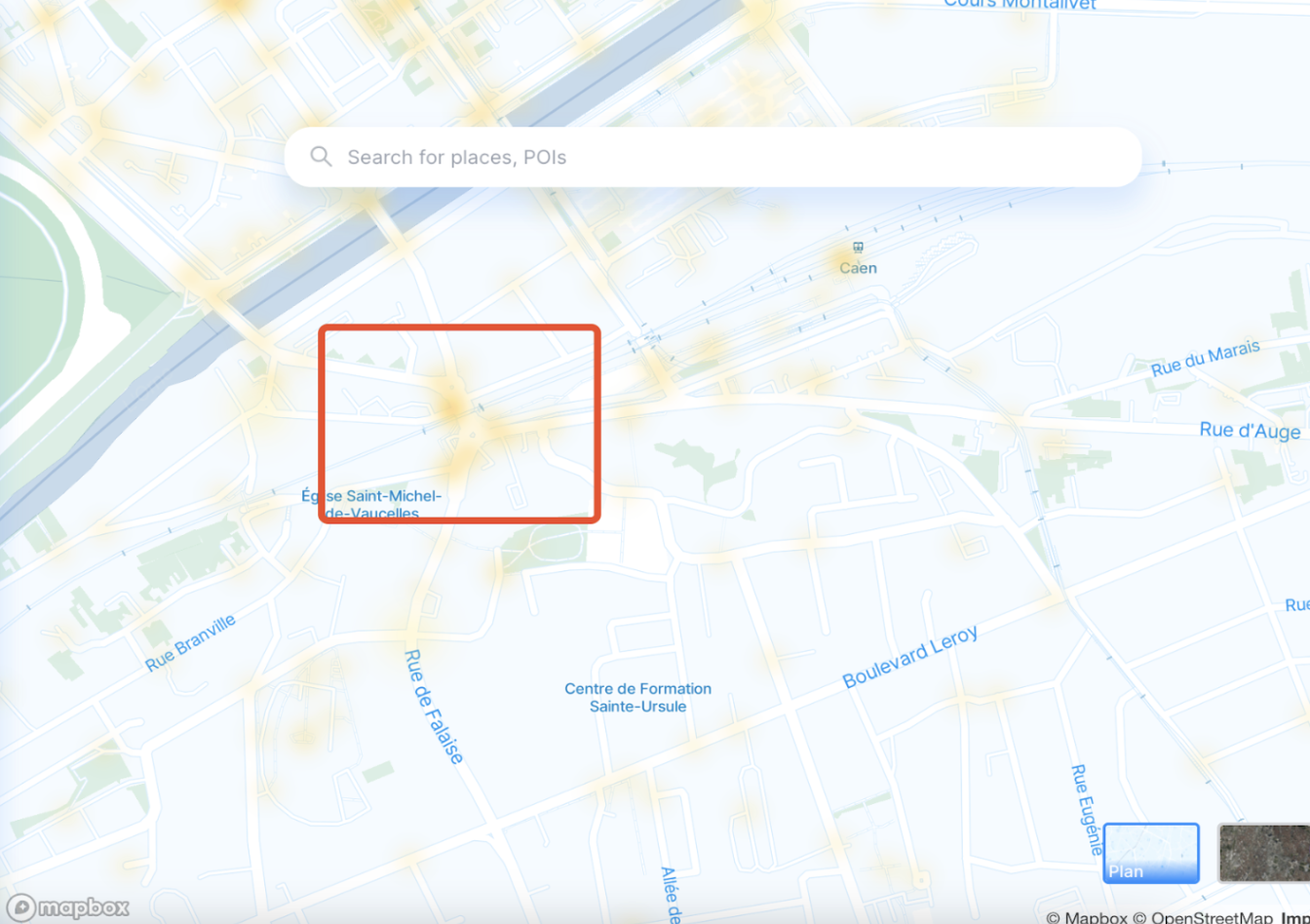 Let's illustrate a typical example of a ZAAC zone on a heat map, showing the density of historical collisions considered serious (fatalities or hospitalized injuries) in the Caen region. For example, by zooming in on the double roundabout on the Vianova platform, we can observe 8 bodily injury accidents resulting in 7 serious casualties (fatalities in red and hospitalized injuries in orange).