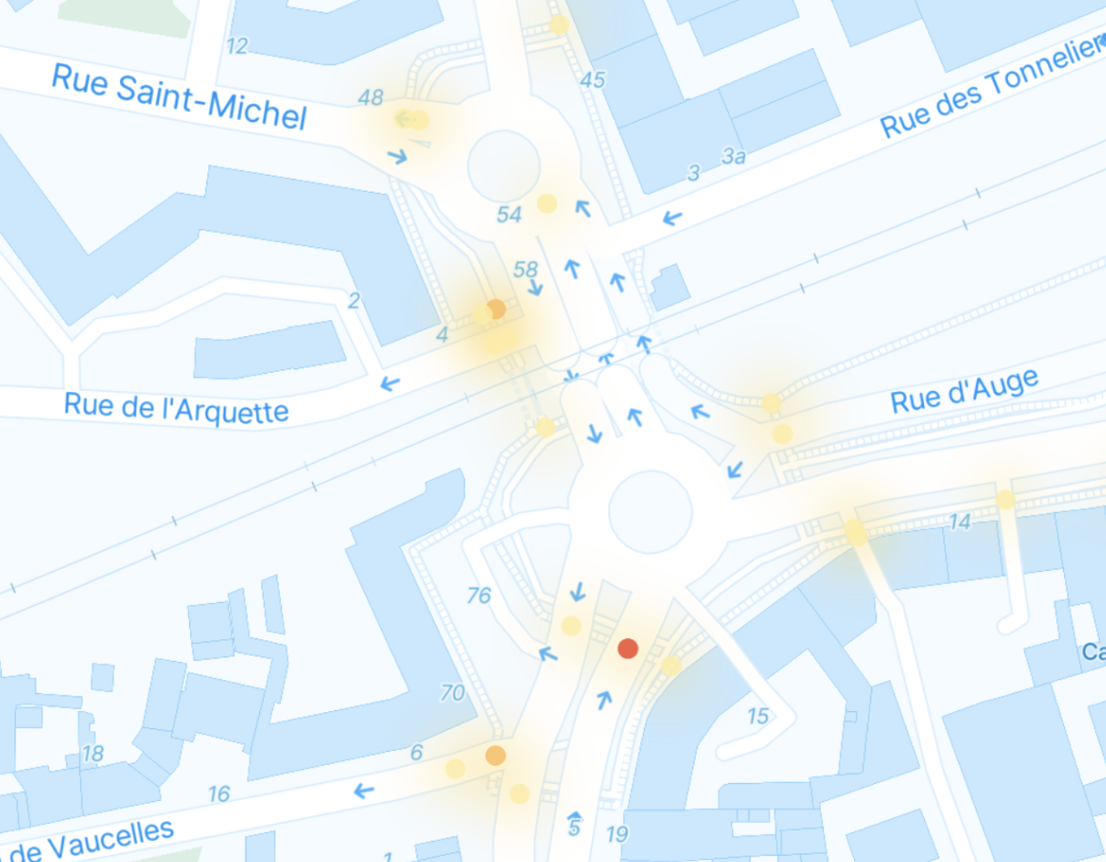 Vianova’s approach seamlessly integrates Traxy data (known as the Traffic Accident Analysis Bulletin, or 'BAAC file'), a comprehensive French government resource, to provide valuable information on historical collisions. BAACs play a crucial role in identifying areas of concern and guiding proactive measures to improve safety. In order to demonstrate how the functionality works while protecting the privacy of individual incidents, Vianova has developed a synthetic data set of collisions which behaves similarly to the recorded data.