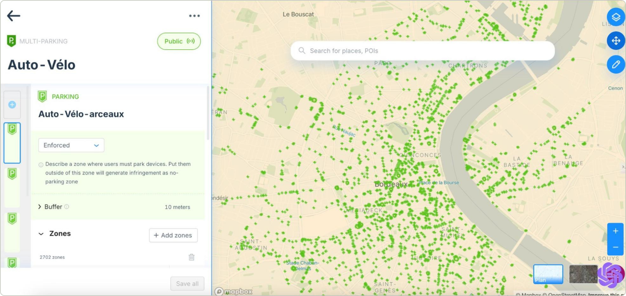 While Bordeaux Métropole had successfully deployed various shared mobility services, the city faced significant challenges in keeping its mobility regulations up to date. The manual process of updating parking regulations and monitoring compliance was becoming increasingly complex and time-consuming. With over 7,000 bike racks and multiple mobility operators, the city's team spent countless hours on data entry and updates, leading to potential errors and delayed response times to changing mobility needs.