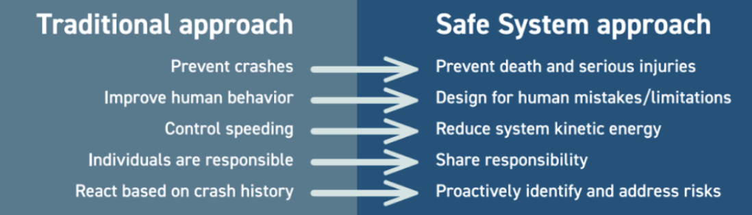 Unlike traditional road safety methods, the Safe System approach starts with the assumptions that people will make mistakes, and that it is important to design roads with human limitations in mind. Knowing that individuals will mess up now and then, it makes sense to take a proactive approach to identifying and addressing risks before crashes occur.