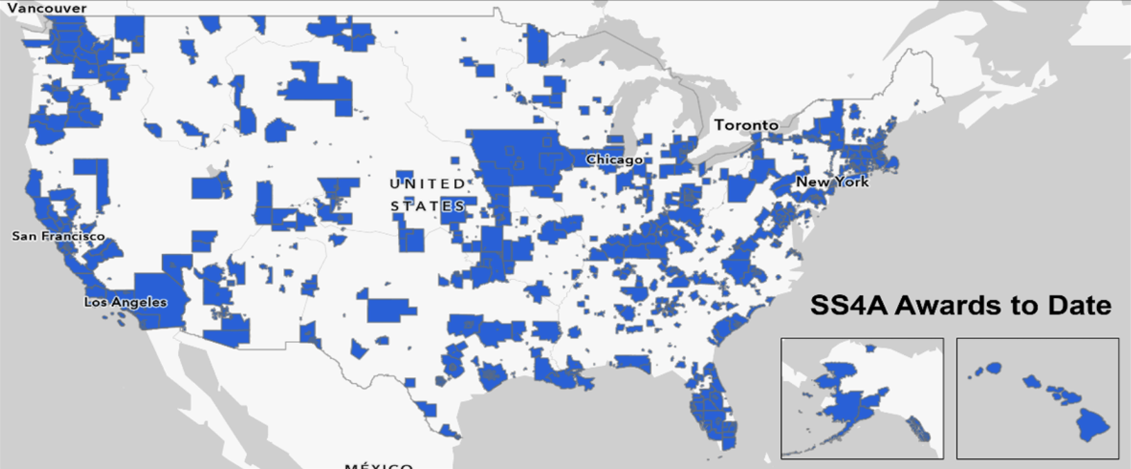 The USDOT’s Safe Streets For All (SS4A) program was established by the Bipartisan Infrastructure Law to provide funding to local and regional governments for the development of plans, or the implementation of those plans, that advance the Safe System approach to road safety planning.