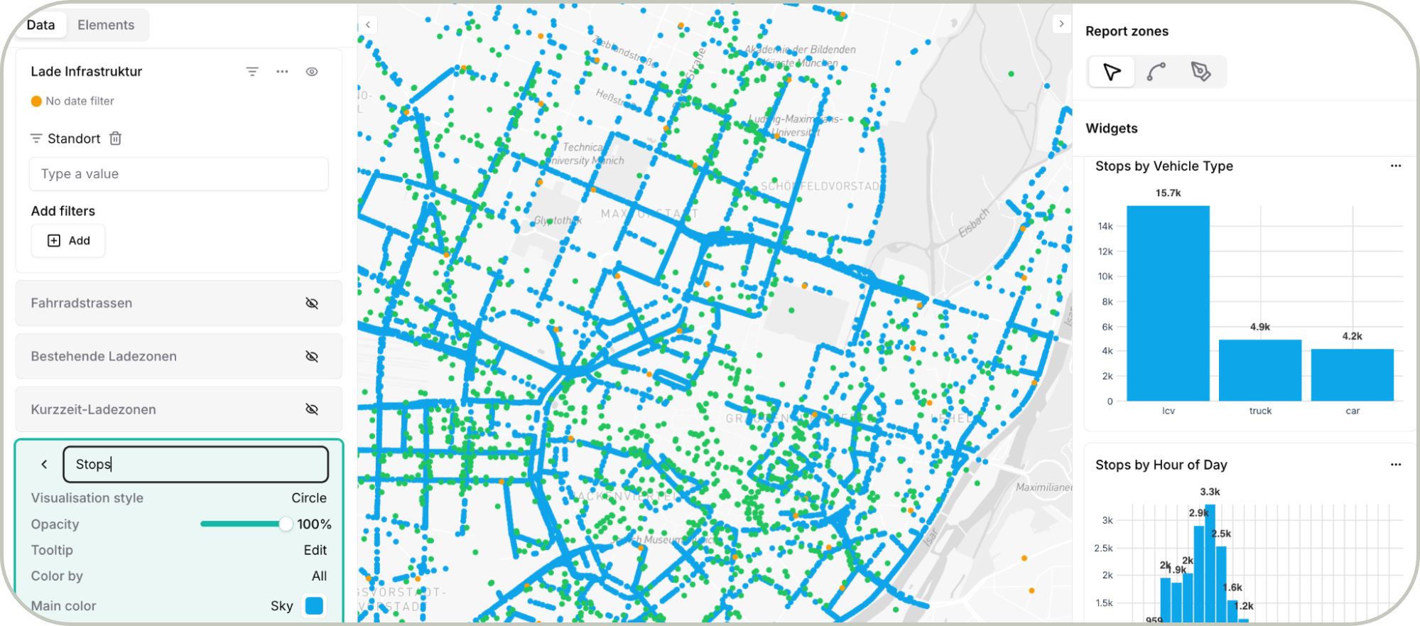 Through this comprehensive approach, Munich has established a foundation for more informed data-driven urban logistics planning. The project provided actionable insights for expanding the current set of loading zones and implementing dynamic curb management strategies and serves as a model for other cities facing similar challenges in efficiently managing freight delivery. Recommendations included locations for many different types of loading zones, for example: