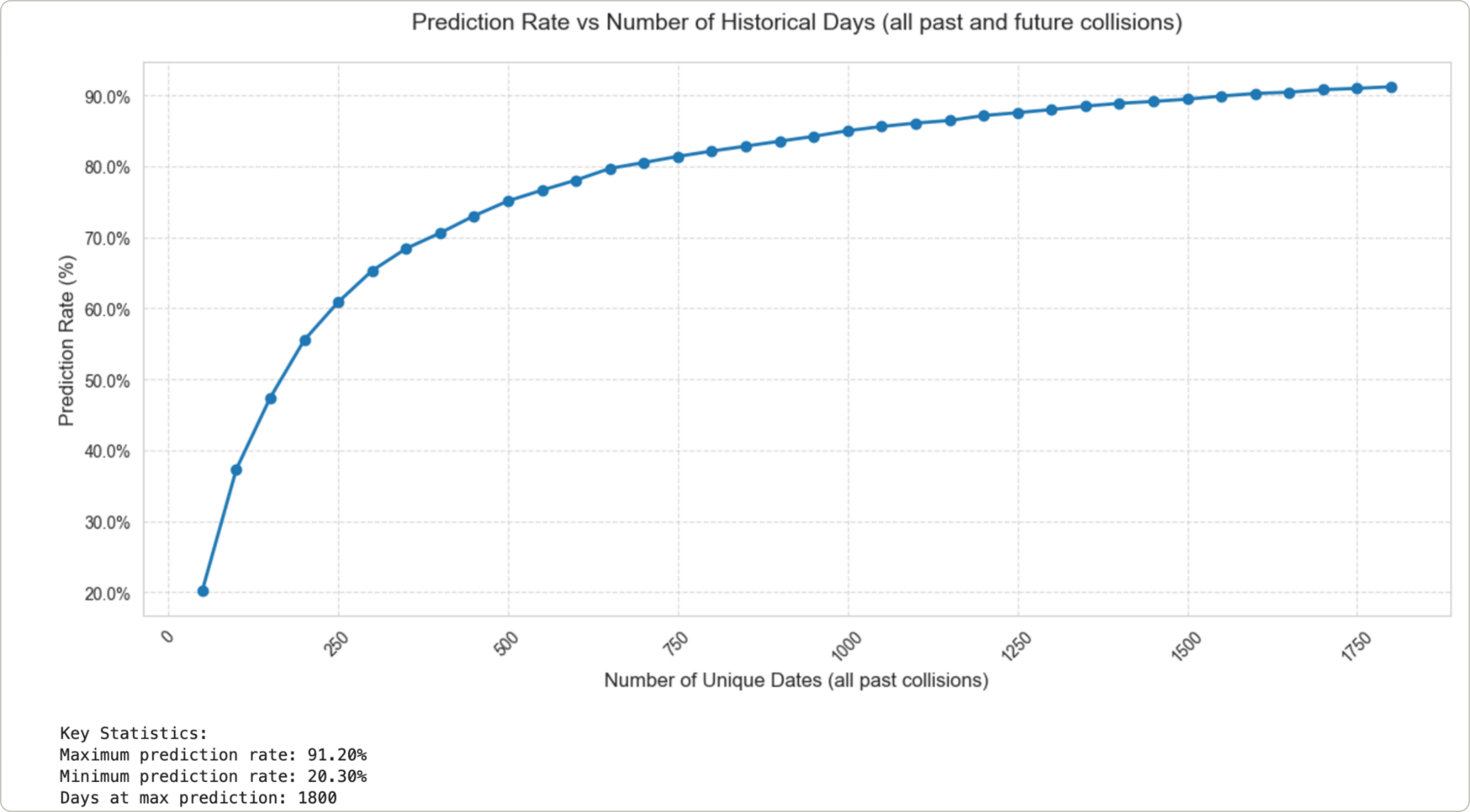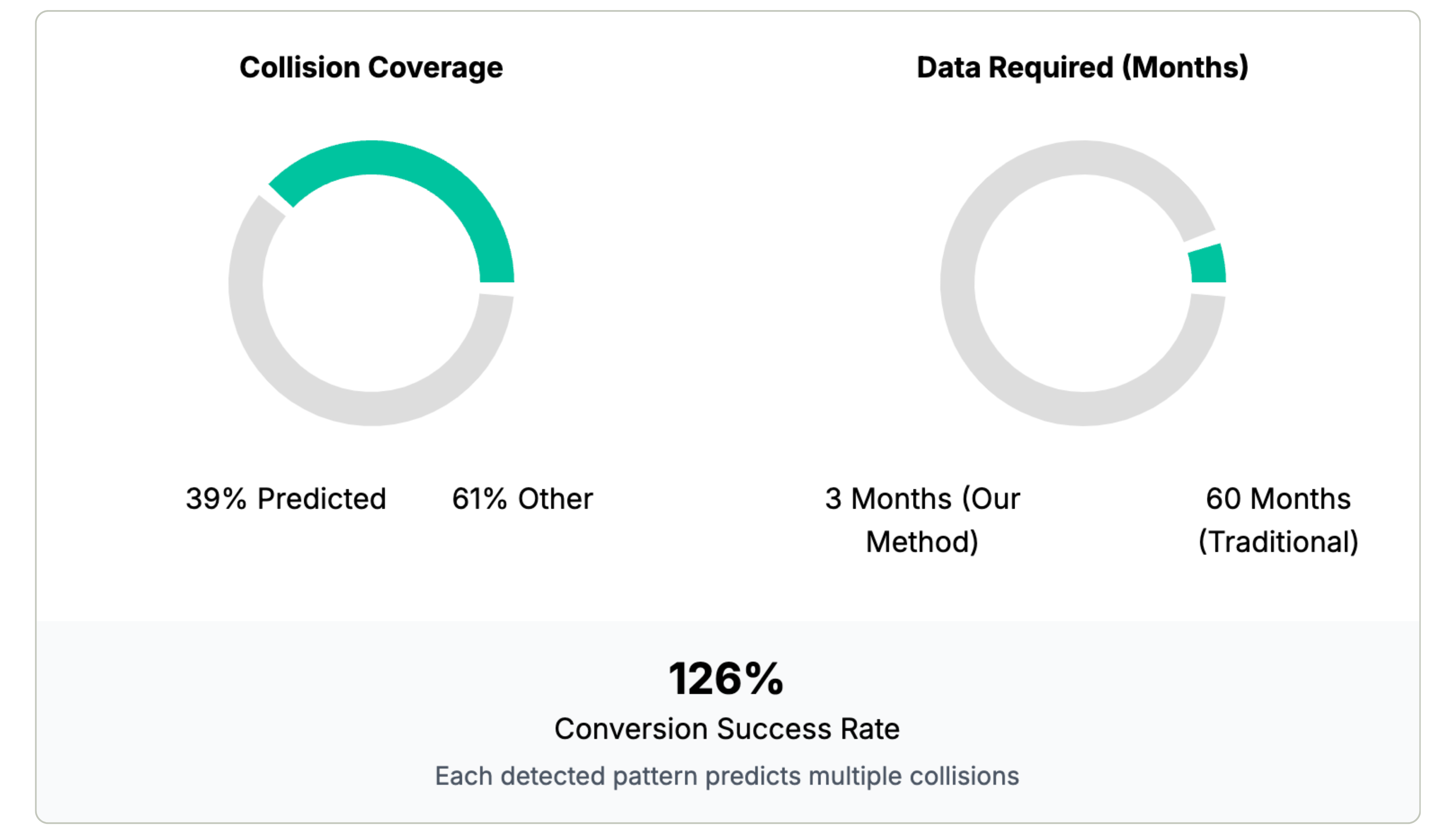 The most striking advantage of behavioral data emerges when considering time requirements. To match the predictive power of just 89 days of harsh braking data, we would need 430 days of historical collision data for general collision prediction. Even more dramatically, for serious and fatal collisions (KSI), we would need an astounding 2,400 days (over 6.5 years) of historical KSI collision data to achieve the same predictive power.