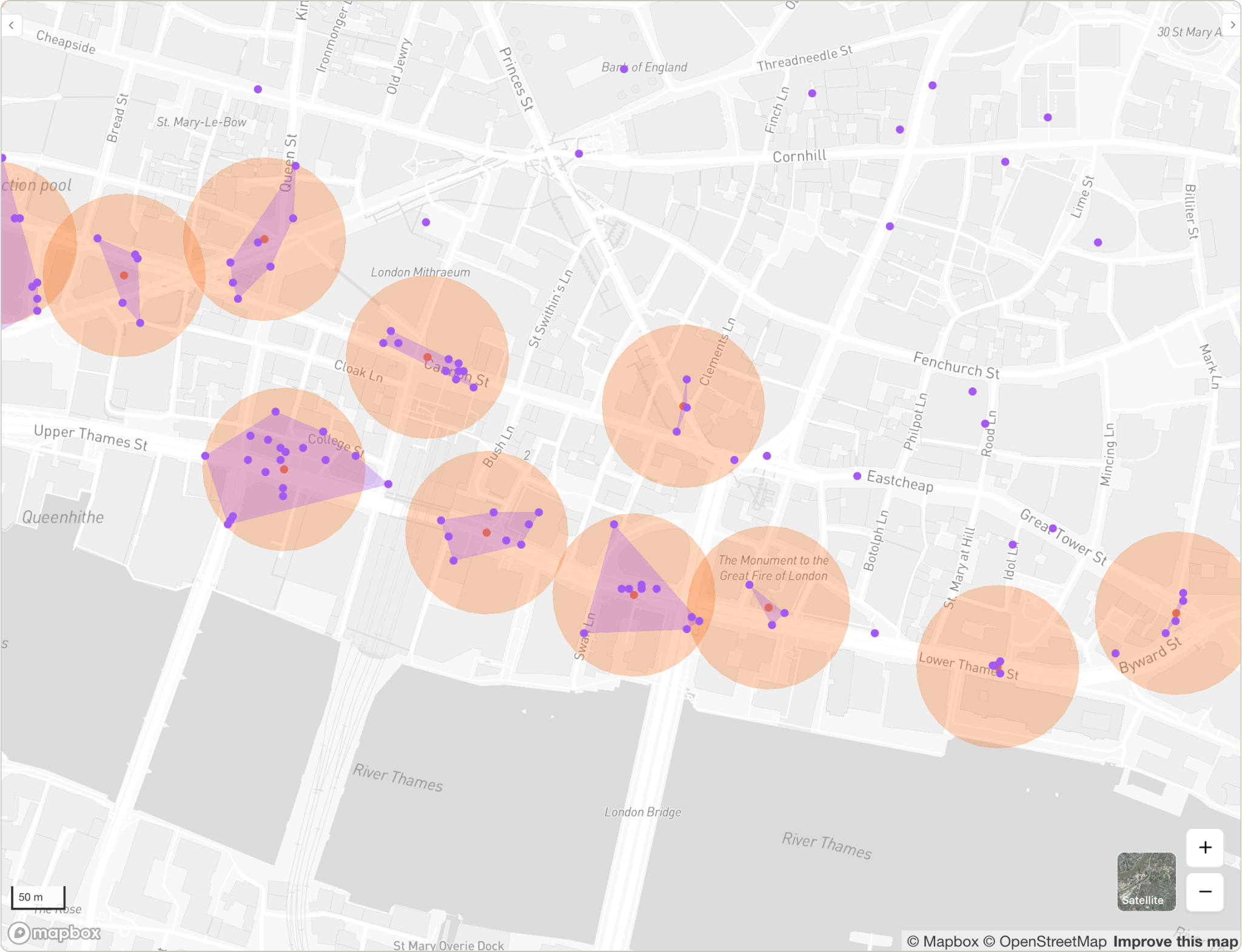 Our analysis looked at three months of harsh braking data, using a clustering algorithm to identify locations where multiple vehicles suddenly braked. This process revealed 2,031 cluster centroids, which we considered as distinct risk locations. Each cluster represents a circle with approximately 75 meters in diameter, comparable to a city block.
