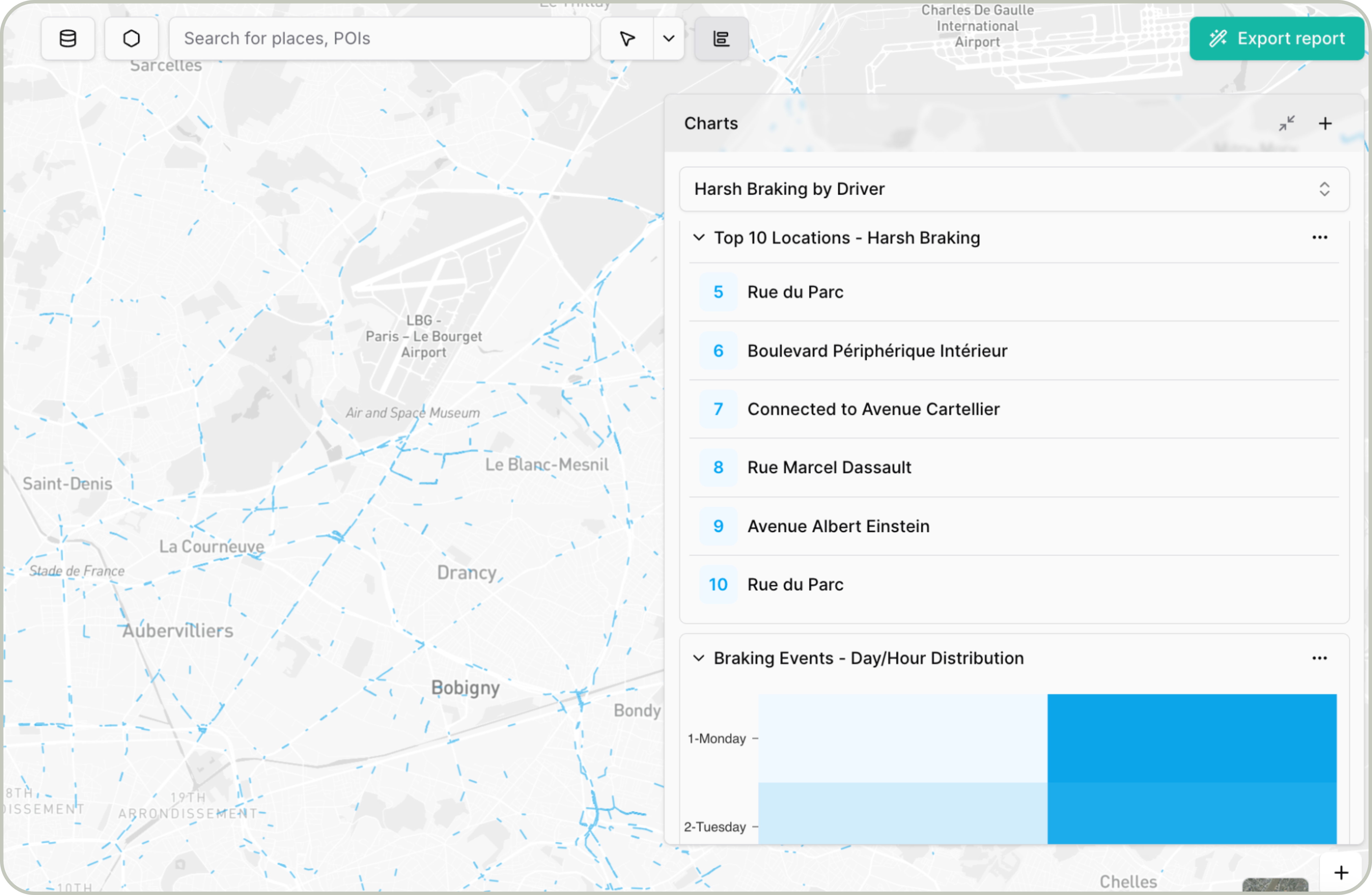 Vianova integrated seamlessly with the operator’s telematics provider via API, enriching raw data with road context, temporal trends, and driver profiling. This enabled the team to identify high-risk drivers, flag hotspot zones, and generate automated reports that informed both coaching strategies and internal alignment.