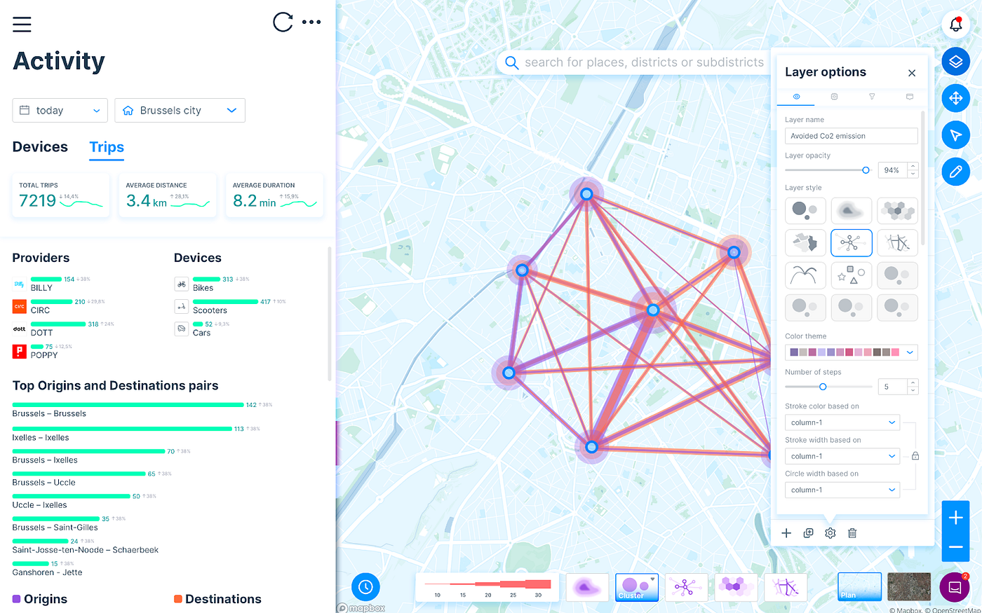 - Activity: to visualise metrics and create their own insights based on defined (districts) or custom geographies (public transport stops)