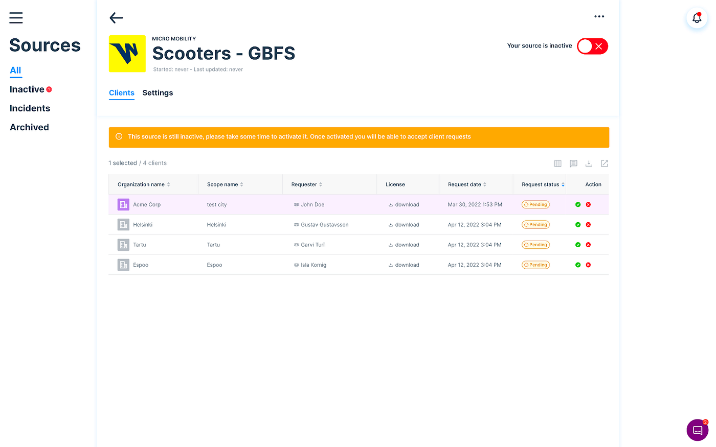 The Vianova Software automatically reports unavailable or broken API from data providers. Cities and Operators have access to the Feed Doctor that notifies them in case of API issues. Data Quality issues can also be linked to operational issues such as vehicle status update in the warehouse or vehicle GPS accuracy.